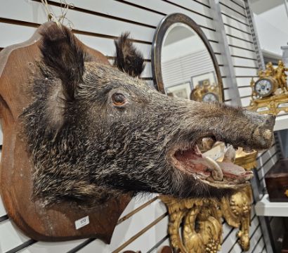 Taxidermy boar's head mounted on an oak shield-shaped plaque, 54cm high