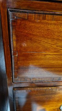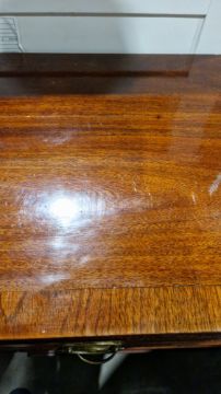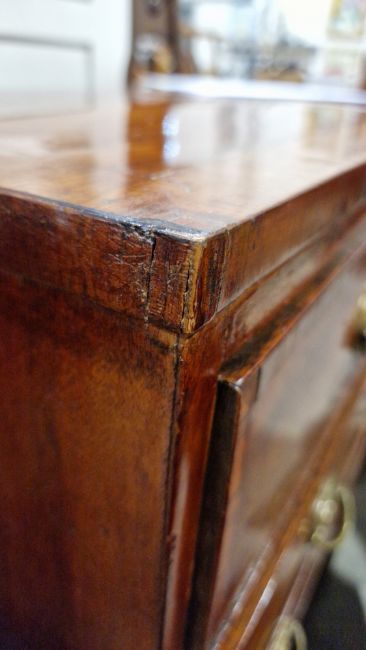 Surface scratches, scuffs and knocks. Some splits to the top, split to left side, and some splits to veneer. Small repair to veneer front left corner of top. General wear and tear.
