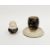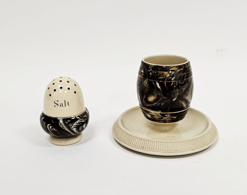 Macintyre pottery agate ware 'acorn' shaped salt and an egg-cup on fixed stand, late 19th century printed black registration lozenges and impressed factory mark, the salt of acorn form, pierced and inscribed Salt, the barrel-shaped egg-cup on fixed stand