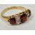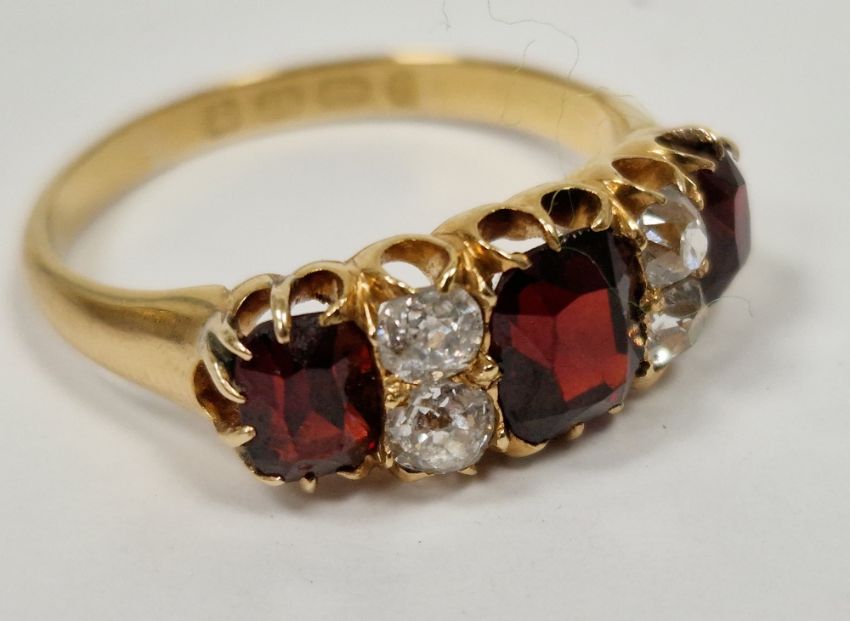 18ct gold, garnet and diamond ring, the three graduated mix cut garnets interspersed by two pairs of old cut diamonds, finger size S  Condition Report Weight approx. 4.97gramsSome light surface scratches and some inclusions in diamonds. Very tiny chips/nibbles to lower edges of garnets. General wear and tear.
