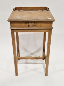 Early 20th century pine child's desk with sloping lift lid writing surface, on square legs with a H-stretcher, 83cm high x 47cm wide x 38cm deep