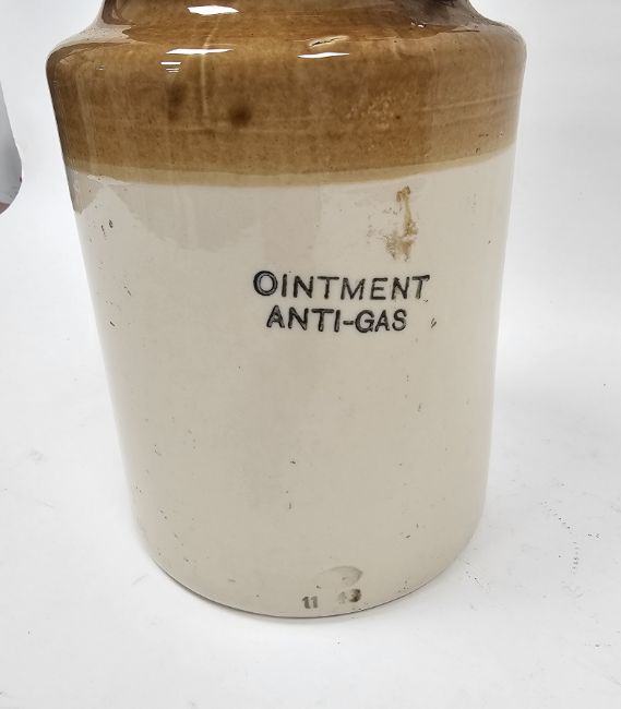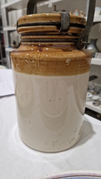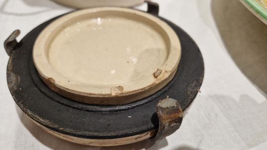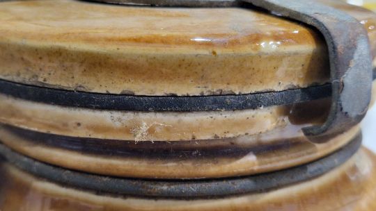 Some surface marks and accretions. No cracks. Small nibbles and chips around edge of lid. Rubber seal with embrittlement. General wear and tear.