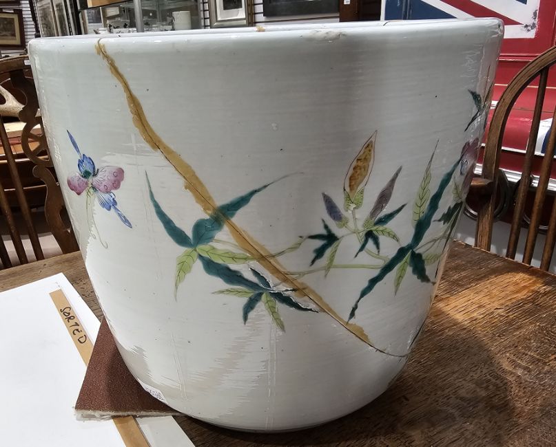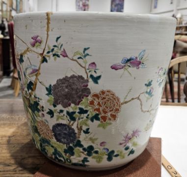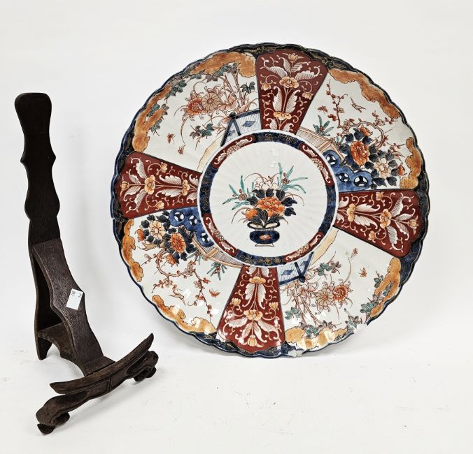Japanese Meiji period (1868-1912) Imari pattern fluted charger on wooden stand, painted to the centre with a jardiniere of flowers within fan-shaped cartouches of bamboo and flowers and red ground foliate panels within petal-shaped rims (chipping to rim), 45.7cm diameter, together with a Chinese porcelain famille rose jardiniere, painted with insects amongst flowers (extensively damaged and repaired, losses) 31cm high (2)