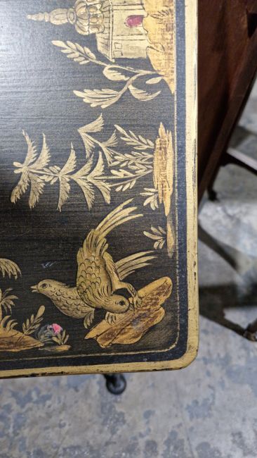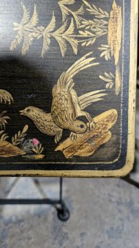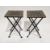 Pair of modern metal folding lamp tables, the square black tops with chinoiserie-style decoration, on folding black finish bases with ball feet, 60cm high x 40cm wide (2)