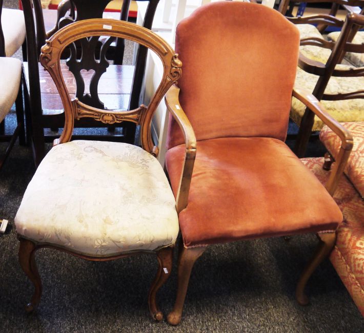 Early 20th century walnut-framed open armchair in the Queen Anne manner, upholstered in a pink fabric, on cabriole legs, 93cm high x 56cm wide x 50cm deep and three unmatched Victorian balloonback dining chairs (4)