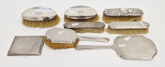 Assorted silver mounted dressing table items, including: an Art Deco engine turned mirror and three brushes, hallmarked Sheffield, 1935, Walker & Hall, two clothes brushes, engraved with entwined Gothic initials and an embossed brush (7) together with silver engine-turned cigarette case, hallmarked London, 1935, makers marks for probably for Walker & Hall, with gilt interior, engraved with inscription Barbara from Cliff, 3.8.36, 5.ozt