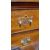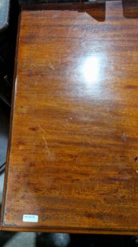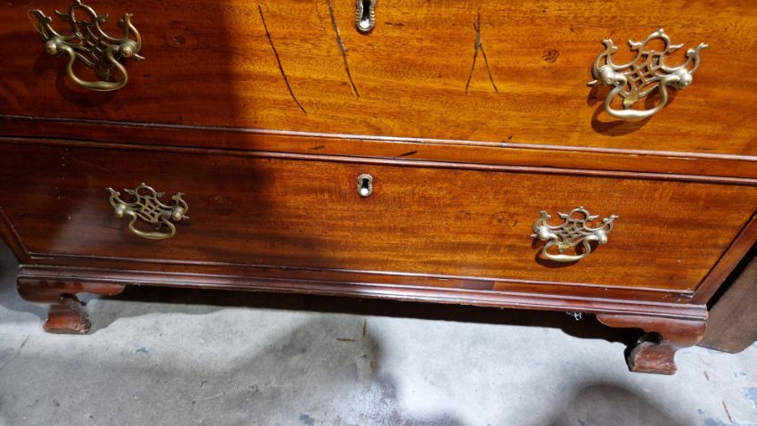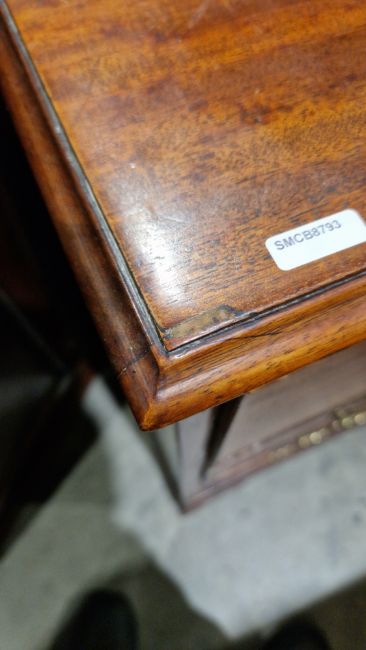 Surface scratches, scuffs and knocks. Some stains to the top. Area of loss to the beading on one drawer, one handle loop missing, lock missing from one drawer, small area of repair and loss above front left foot. No splits. General wear and tear.