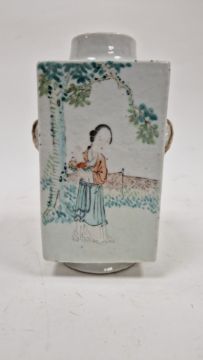 Chinese porcelain square section Cong form vase, late Qing Dynasty/early Republic, iron red four-character mark to base, painted in the famille rose palette with a figure within a garden before terracing holding flowers and figures before mountains alternating with calligraphic inscriptions in iron red and black, with gilt elephant ring mask handles, on a foot (minor chipping to rim), 19cm high