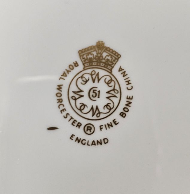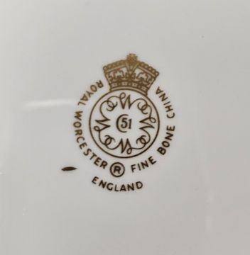 20th century Royal Worcester red-ground fruit decorated cabinet plate, printed gilt factory marks, impressed mark, finely painted with a central cartouche of fruits by M. Johnson, the red ground gilt with scrolling acanthus, flaming urns and paterae, 27cm diam. and Royal Worcester pale-blue ground cabinet plate, printed black factory marks, puce pattern no. 2458, impressed marks, printed with a loose bouquet of garden flowers to the centre, the border gilt with scrolls and flowers, within shaped gilt rim, 27.5cm wide (2)