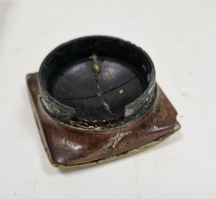 Inkstand - area of loss to corner of compartment lid, areas of loss to brass and tortoiseshell on one inwell lid, brass surround around inkells detaches, rosewood tops of both inkwells detach from bragg hinges, one with loss to section of wood.
