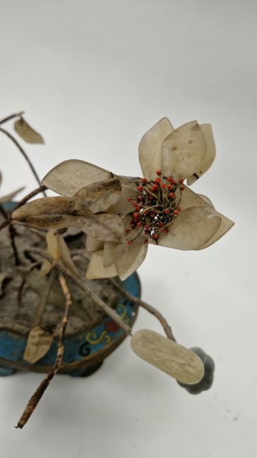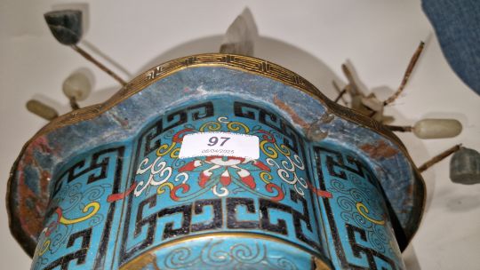 Chinese hardstone and wirework model waterlily plant in cloisonne enamel quatrefoil jardiniere with panels of scrolling lotus blossom on a turquoise ground, on four bracket feet, 40cm wide x 30cm high overall