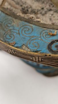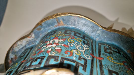Surface scratches, scuffs, accretions. Rim mishappen and dented in and down in places. Petal section off but present, some small chips and losses to flowers and petals. Numerous areas of loss and cracks to the enamel. Bent and mishappen feet with losses to enamel. General wear and tear.
