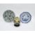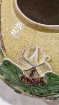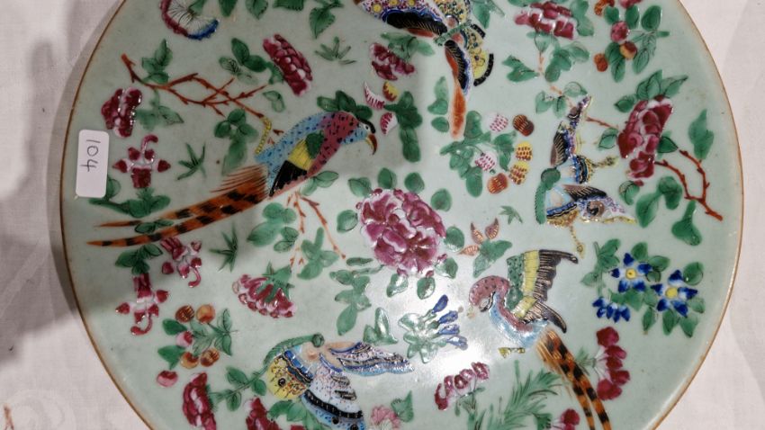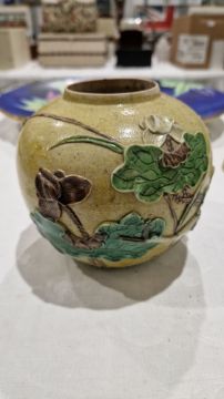 Chinese late Qing Dynasty yellow ground ginger jar and cover moulded with lotus and water plants, reserved on a mottled yellow ground, with wooden stand (hairline crack to shoulder), 12cm high, a Chinese export octagonal plate painted with exotic birds and willow flower strewn landscape (extensively cracked and repaired), 22cm wide and a Canton famille rose enamel plate painted with exotic birds and butterflies amongst peony, with blue seal mark to reverse, 25.7cm diameter (3)   Condition Report Blue & white plate - Light surface scratches, cracks and repairs throughout.Enamel plate - light suface scratches, accretions, chip to base ring.Vase - Light suface marks, accretions, hairline to shoulder.General wear and tear.