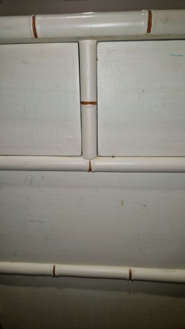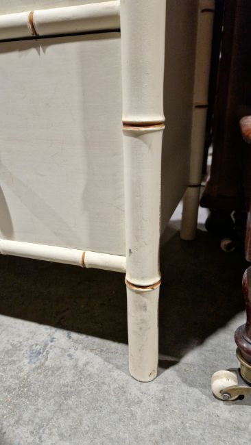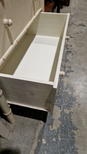 Modern white painted wooden chest of two short and three long graduated drawers with faux-bamboo frame and turned knob handles, 89cm high x 74cm wide x 42cm deep
