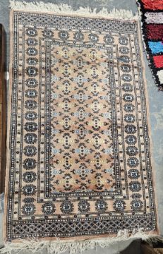 Eastern peach ground rug with geometric field, multiple geometric borders, 154cm x 97cm (some wear)