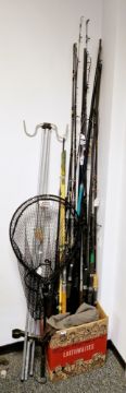 Collection of approximately thirteen carbon rods including Jarvis Walker up tide, Dam red carbon, Mitchell prospin, Abu Garcia, Leda together with an Abu Garcia telecarp and landing net