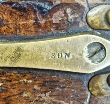 Mahogany 5" fishing reel with brass star back and foot , stamped patent no. 13388/85 and ' SUN ' together with 3" mahogany and brass star back fishing reel (2)