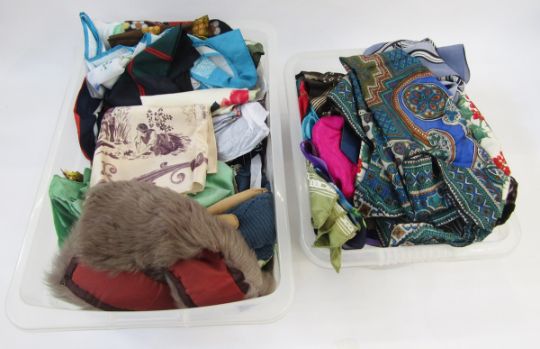 Large quantity silk scarves to include Liberty, and a  mongoose fur stole with velvet lining (2 boxes)