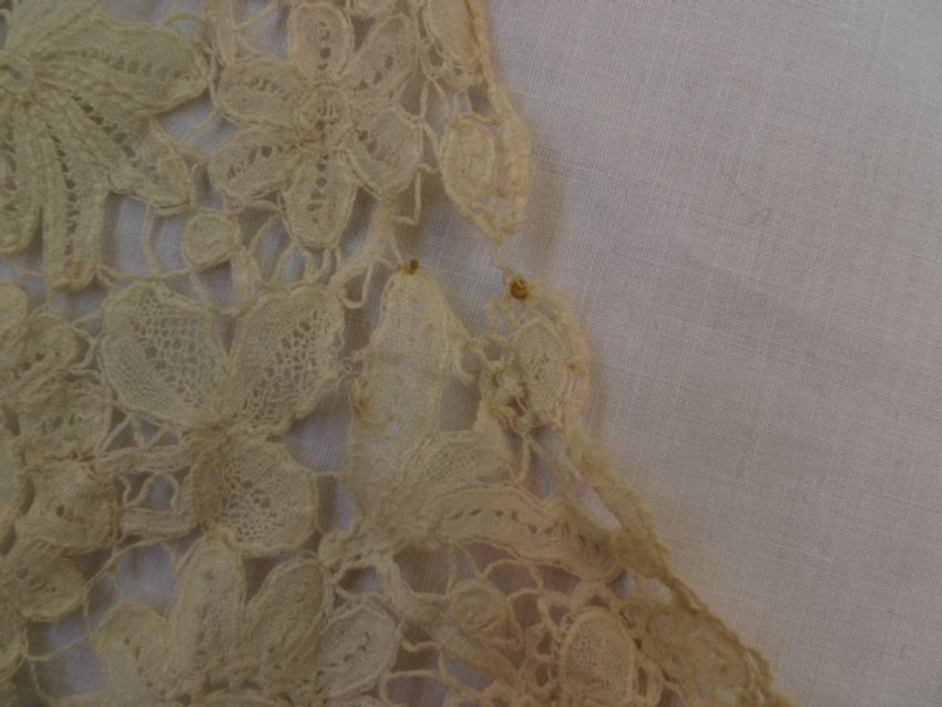 The veil overall is good, I found two tiny holes in the net and a small black 'bead' mark - please see attached images. The collar has light staining around the neck and there is bit of loss - see images, the sleeve appears to be just that.