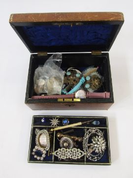 Late 19th / early 20th century brown tooled leather covered jewellery box containing a quantity of costume jewellery, including an antique foil curved brooch set with four foil back faceted purple stones in a claw set closed back setting, 6.5cm long, shoe buckle, other marcasite set jewellery, mother of pearl buttons and buckles, silver cased fruit knife, etc