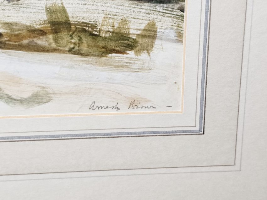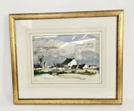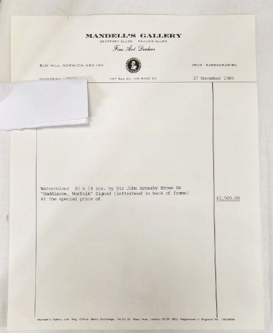 Sir John Alfred Arnesby-Brown (1866-1955) Watercolour "Haddiscoa, Norfolk", signed, Mandell's label verso and Mandell's invoice dated 1989 (letterhead in back of frame from LR Nightingale), 24.5cm x 34.5cm From the collection of the late Maurice Costley John Arnesby-Brown was a British landscape artist. Influenced firstly by the Barbizon School and then the Impressionists, Arnesby-Brown is known for his pastoral and coastal scenes, quite often including cattle, in the “en plain air” tradition. He came to painting after his career as a county football player in Nottinghamshire. He studied at the Bushey School of Art and then the Nottingham School of Art. He spent time in Cornwall and also Norfolk. He had a solo exhibition at the Leicester Gallery in London 1909 and his work is also represented in many public collections including the Tate. Condition Report Recto: Good condition, no obvious signs of fading, no warping or buckling of paper. Framed and mounted, both in good order.Verso: Glazed to show old gallery (LR Nightingdale) attribution 1936. Presentation label April 1936More recent gallery label - Mandell's.