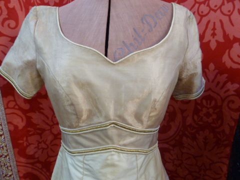 Silk and silk organza 1950's evening dress with label 'Jacqueline Hogan', with gold thread detail to the bodice, gold thread ball and loop fastening at the back, sweetheart neckline, puff sleeves, the organza of the sleeves are wearing thin, full length, this dress was supposed to have belonged to the Duchess of Richmond, with a black lace cocktail dress labelled 'Valerie Dresses' (2)