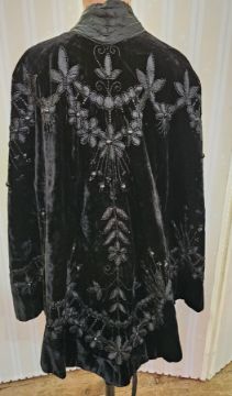 A Victorian black velvet evening cape, three quarter length heavily embroidered with faux jet, satin ribbon and braid, a hook and eye fastening, the two central button fastenings full jet and padded satin, one has major loss, the back hem is scooped and the decorations are in loops with flower details