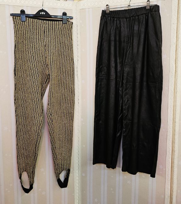 A pair of gold coloured thread and elastine slacks with elastic stirrups labelled Lolita size 42, a pair of faux leather trousers, another pair of leather trousers, biker style with zips, and a Betty Barclay pair of leather and half black elastine trousers (4)