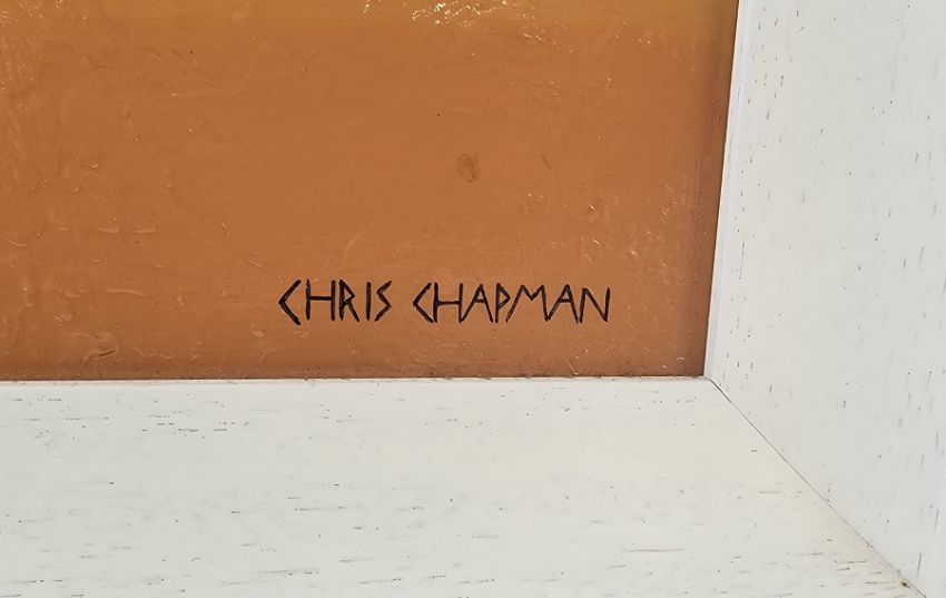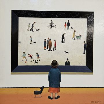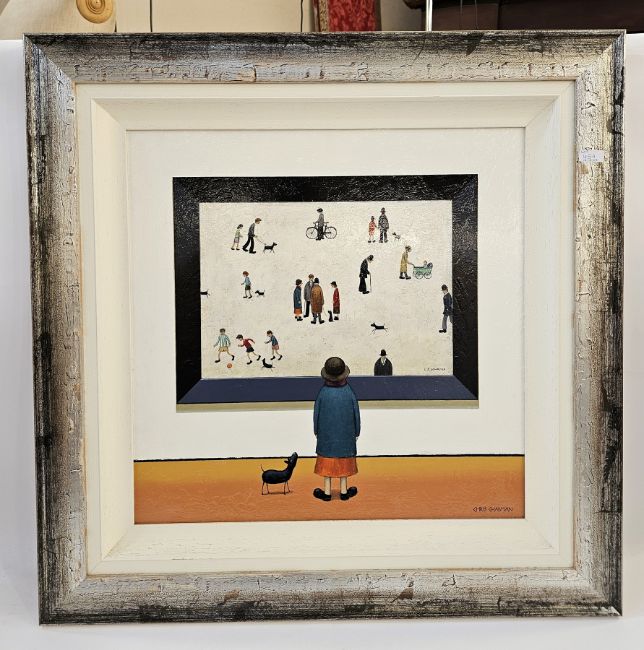 Chris Chapman (Contemporary) Oil on board Woman and dog looking at a L S Lowryish (Lowry) painting, titled to verso 'Dribbling', signed lower right, 60cm x 60cm, framed