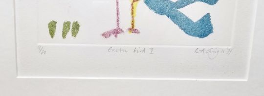 R A ???gor (20th century) Aquatint "Exotic Bird 1", limited edition, signed, titled and numbered 9/20 in pencil within margin, dated '91, framed and glazed, image size 19cm x 23cm