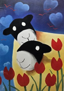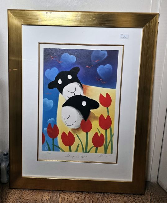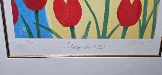 Mackenzie Thorpe (b. 1956) Signed limited edition print  'Sheep in lane' no. 16/850, titled and signed in pencil to margin, Washington Green gallery blindstamp, image measures 46cm x 31.5cm, framed and glazed