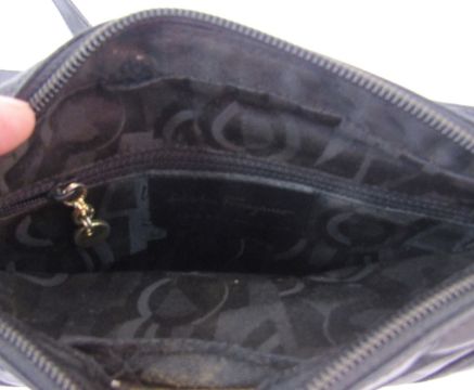 Salvatore Ferragamo black leather cross body bag, banded rectangular black leather with grosgrain and gilt metal adornment to front pocket, label to inside inscribed DJ-21 4183 made in Italy (some wear to edges and gilt metal), and a Russell and Bromley black patent shoulder bag with gilt metal rope links (with dust bag)