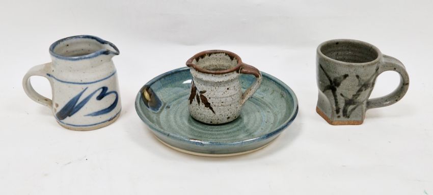 Four pieces of studio pottery to include a Colin Kellam jug with blue brushwork decoration on speckled white ground, impressed marks to base, 11cm high, a Robert Tinnyunt small jug with brushwork decoration on speckled oatmeal ground, impressed mark to base, 8cm high, a Steve Hague dish, 21.5cm diameter, and a mug with impressed 'A' mark to base, 10cm high (4)