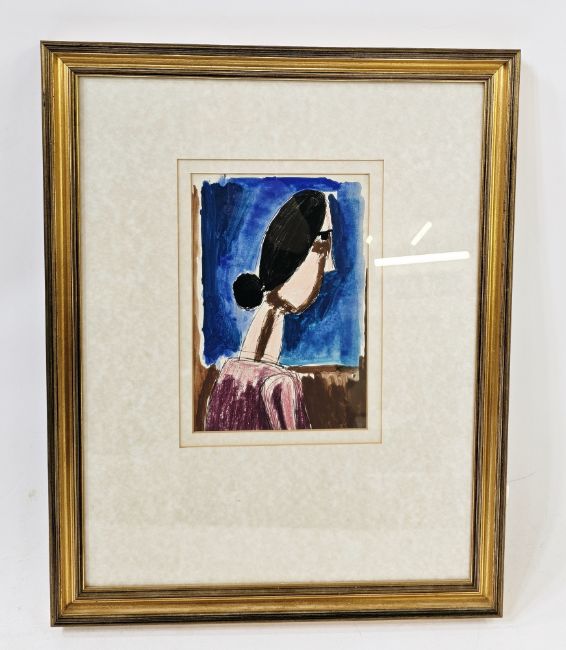 Josef Herman (1911-2000) Watercolour on paper “Lady facing away”, 24cm x 17cm From the collection of the late Maurice Costley  Josef Herman was a Polish/British contemporary artist.  Herman was one of the last European expressionists.  He was a figurative artist who painted working people.  He came to Great Britain in 1940 and had his first exhibition in Scotland.  In 1943 he moved to London and had his first London exhibition with L S Lowry.  In 1981 Herman was awarded an OBE and was elected to the Royal Academy in 1990.