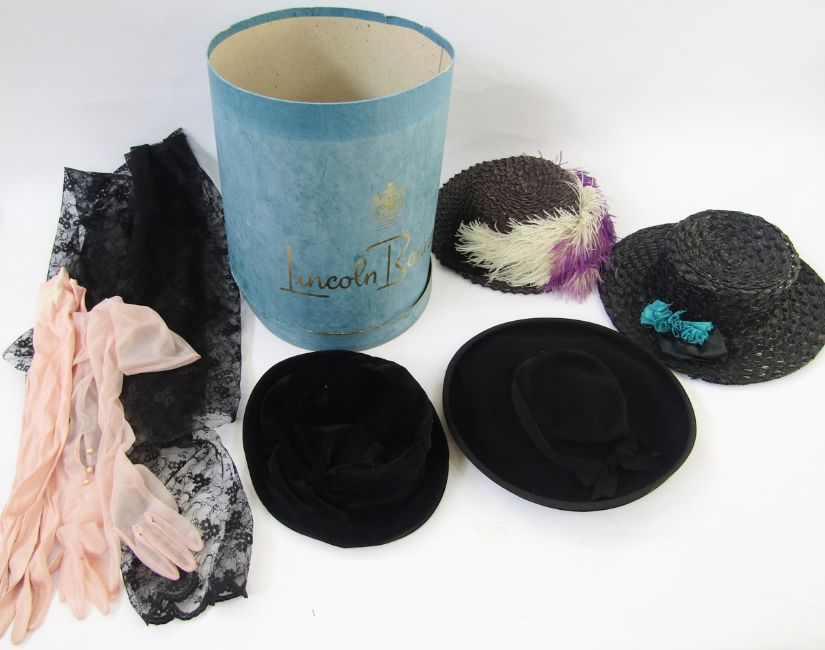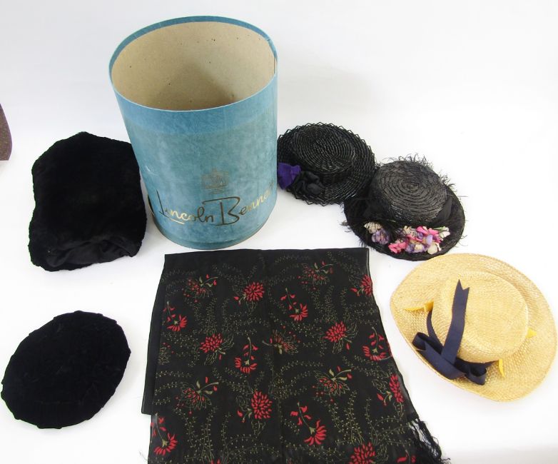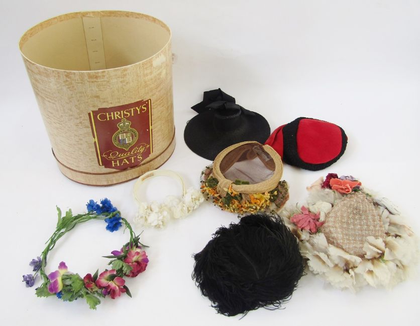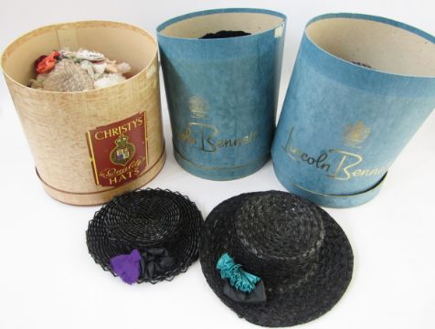 Edna Wallis floral adorned hat, Mitzi black and red hat, 1950's black straw bonnet with bow, feather hat, and quantity theatrical hats in three hat boxes to include Christys' and two Lincoln Bennett boxes (3)