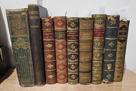 Bindings to include "An Anthology of Modern Verse", full leather, Ealing County School prize binding, another Ealing County School prize binding, prize binding for Latymer Upper School, Hammersmith, another Ealing County School, McDonald, George "The Princess and the Goblin", Blackie & Son 1911, illustrations, colour plates, in poor condition, another Latymer Upper School prize binding and Ealing County School prize binding (9)