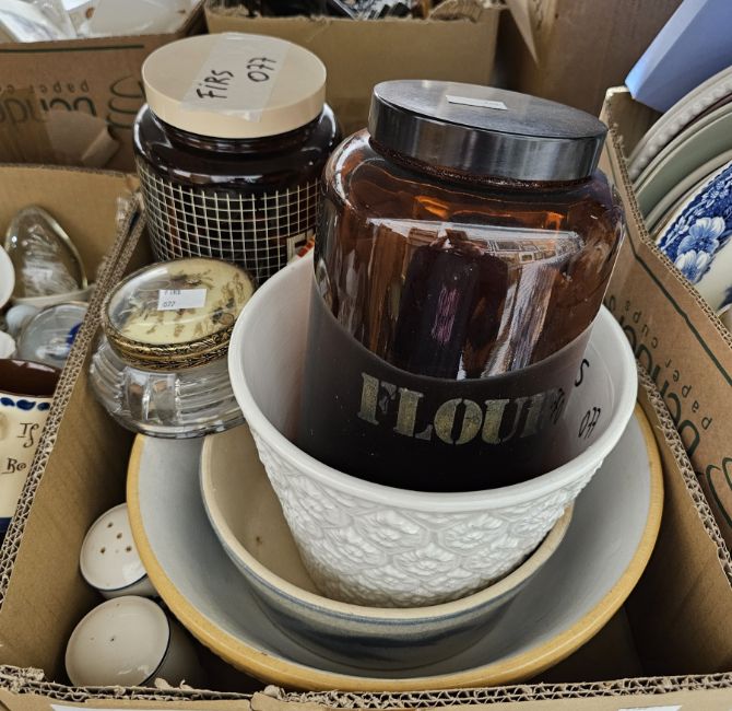 Alum Bay glass Isle of Wight egg-shaped paperweight and others similar, a Torquay double-handled cockerel decorated cup, a Shirley pottery floral decorated chamberpot, a Wedgwood 2003 calendar plate and other items (3 boxes)