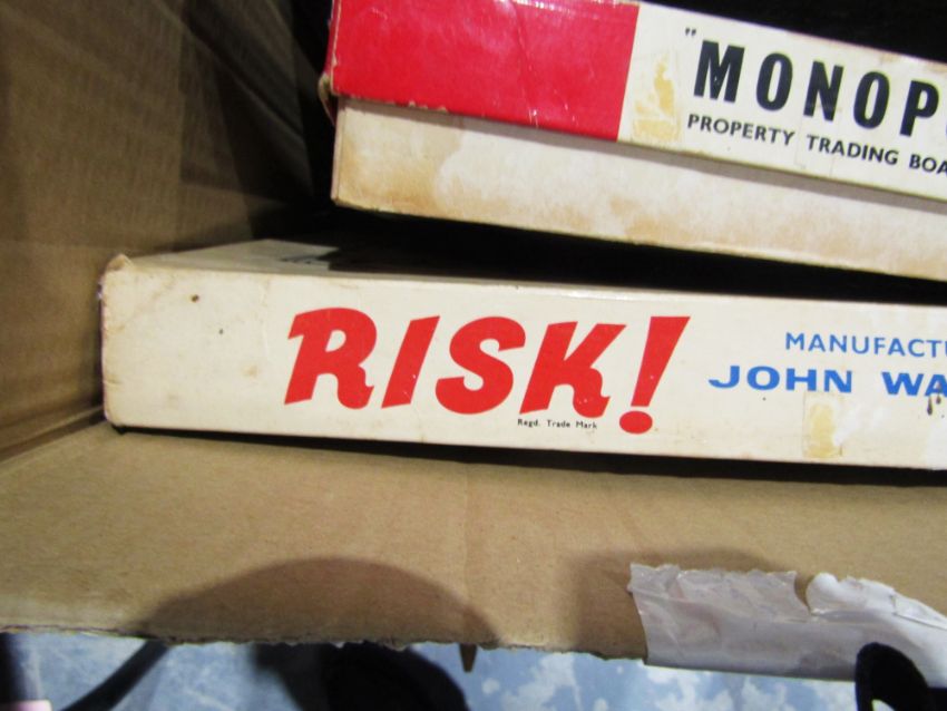 Quantity of toys and games to include Formula Challenge Boy Racer boxed set, Scalextric GP0 set (not in original box), Waddingtons Risk and other items (1 box plus)