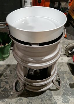 Outdoor firepit/stove made from car wheels and horseshoes with aluminium pan