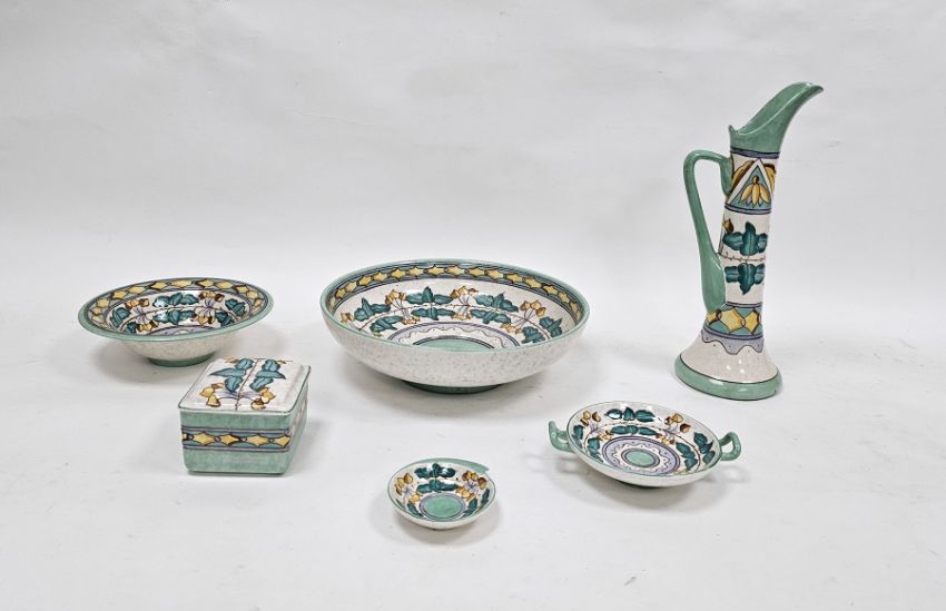 Group of Bursley ware Art Deco pottery designed by Charlotte Rhead, printed black marks, painted numerals, decorated with bands of green, ochre, yellow and brown leaves, within interlocking lozenge-pattern borders, comprising a footed bowl, 29cm diameter, a smaller flared bowl, a tall tapering jug impressed swan mark, whiplash handle, a square section pot and cover, a small two-handled circular footed dish and a small circular salt, all similarly decorated (6)
