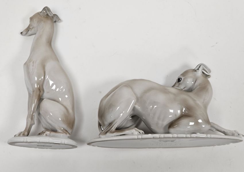 Two Rosenthal porcelain models of whippets/greyhounds, modelled by Theodor Karner, the first modelled seated on its haunches on an oval scroll moulded base, 18.2cm high, the other recumbent, 16.5cm high, printed green factory marks, impressed modeller's mark, shape numbers 80 and 21 (2)