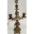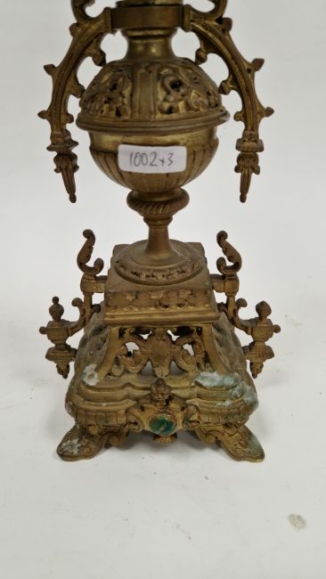 Early 20th century French gilt brass three-piece clock garniture, the bell striking clock with roman numerals on white enamel plaques and two winding holes, movement stamped 2425 AM, 42cm high and a pair of four-branch candle stands (3)