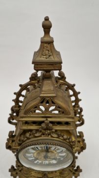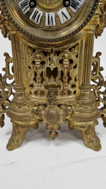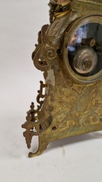 Light surface scratches/marks. accretions and tarnishing to all items. Two screws on backplate are broken and appear to have been drilled or cut away with surrounding area sunken in and worn away. Backplate is slightly separated from body of clock towards top. No key, sold as untested so cannot say whether in working order. General wear and tear.