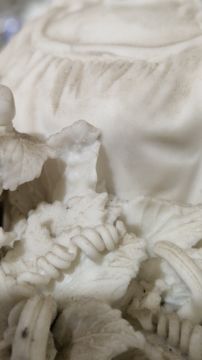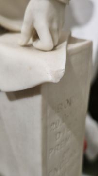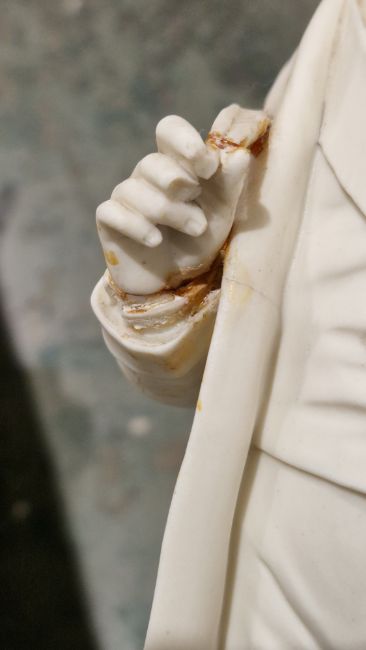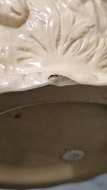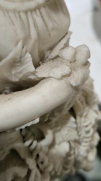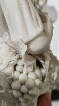 Hill Pottery Company (Burslem) parian figure of Palmerston, standing beside an inscribed column, printed black marks, dated December 6th 1865, on titled circular base, 14cm high, a Continental white bisque bacchic figure of a goddess standing holding a basket of grapes, a white bisque figure of Ariadne seated on a panther, on rectangular plinth base and a Victorian relief moulded pottery hunting jug, with hound moulded  handle, moulded in relief with game (4) (damages and repairs)  Condition Report Jug - Chip to basePalmerston - Break and reglue to arm and surrounding area, loss to end of finger and quill. Chip to sheets of paper on column. Crack to one foot.Ariadne - Chip to baseFemale figure - Numerous small chips and losses to flowers.General wear and tear.