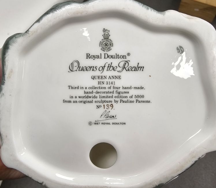 Four Royal Doulton bone china figures from the Queens of the Realm series, printed green marks, modelled after Pauline Parsons, comprising Mary Queen of Scots HN3142, no.727/5000, Queen Victoria HN3125, no.668/5000, Queen Anne HN3141, no.139/5000 and Queen Elizabeth I HN3099, no.2654/5000, all with original boxes, 22.5cm high max (4)