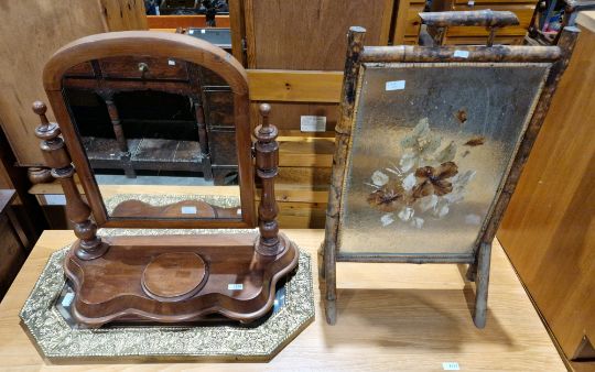 Late 19th century aesthetic-movement bamboo firescreen with flower painted glass panel, 74cm high x 42cm wide, an early 20th century octagonal bevel edged mirror in an embossed brass frame, 74cm x 43cm and a Victorian mahogany swing dressing mirror, 68cm high x 63cm wide (3)
