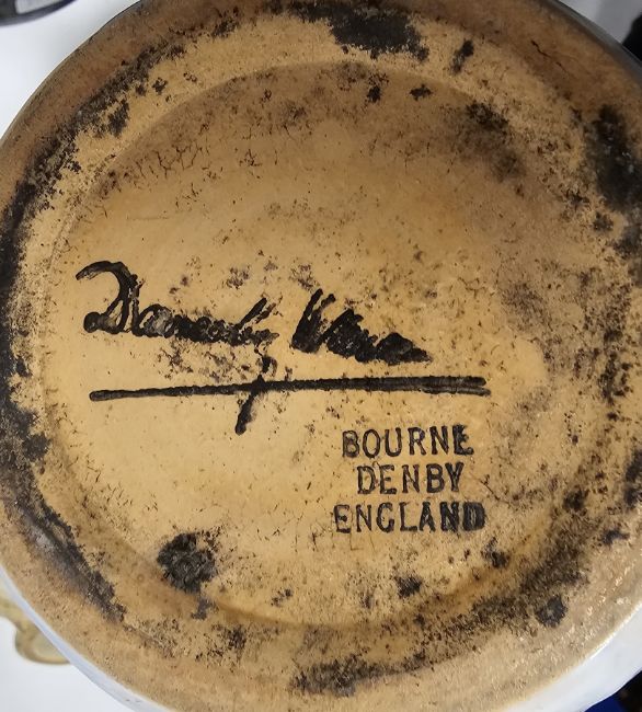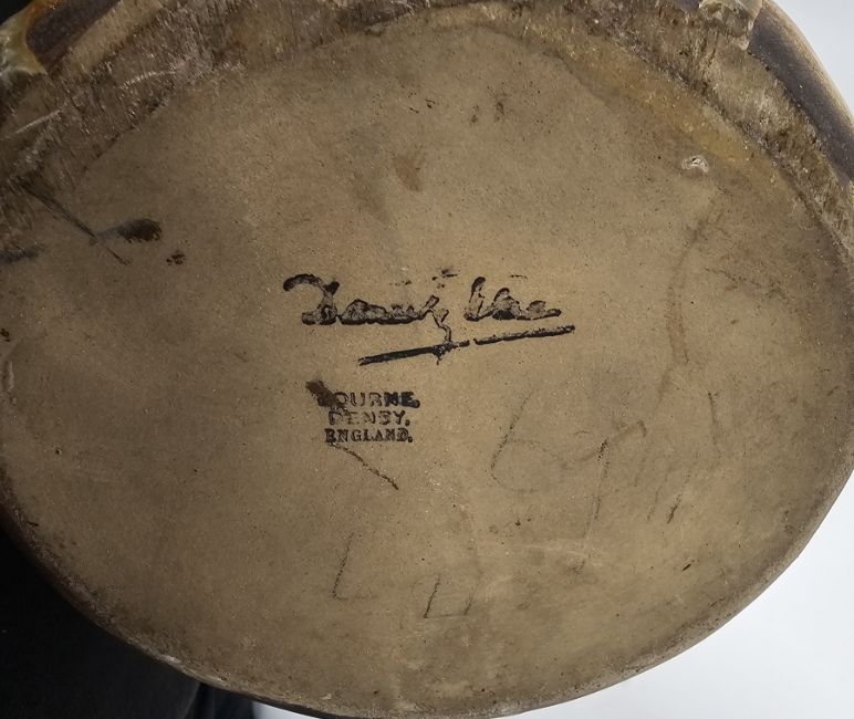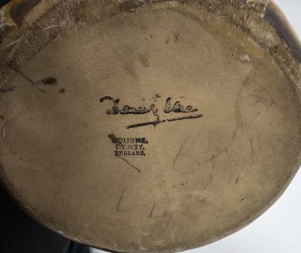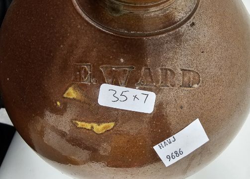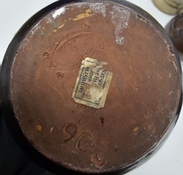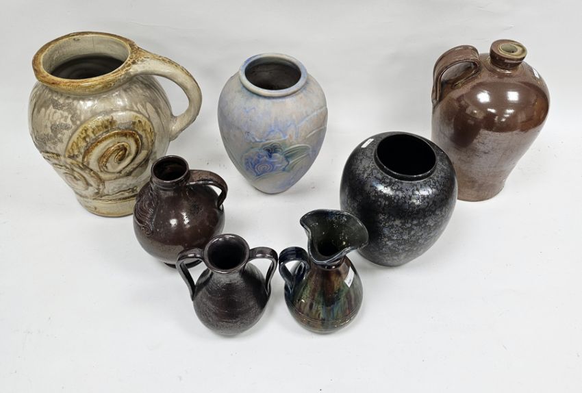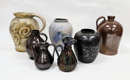 Collection of brown stoneware and other pottery, late 19th/20th century, including: a Doulton Silicone stoneware two-handled oviform jar in lustrous brown glaze, a saltglazed stoneware bellarmine, a waisted flagon impressed E.WARD, a Denby Art Deco oviform vase moulded with stylised flowers and a large jug moulded with spirals, in mottled cream glaze, a Poole Pottery oviform Calypso vase and a Linthorpe-style jug with shaped flared rim, in mottled green, brown and ochre glazes, impressed shape no. 687