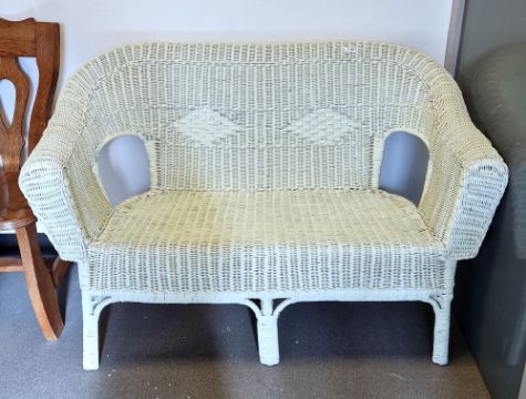 Pale green painted wicker conservatory two-seater settee, 84cm high x 127cm wide x 60cm deep
