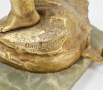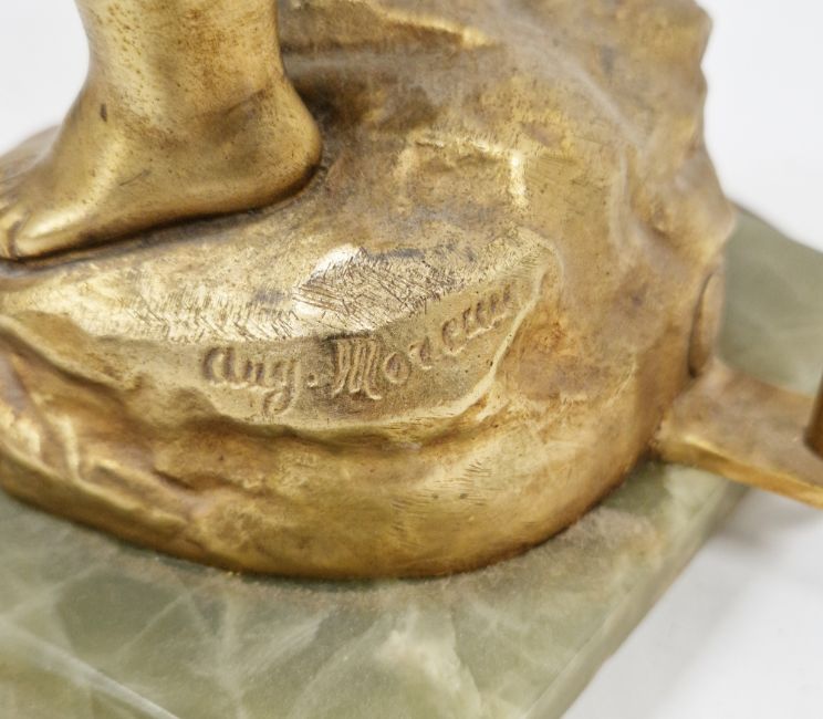 After Aug. Moreau, 19th century French gilt bronze figural lamp base in the form of a boy carrying a heavy water vessel, signed and with foundry mark medallion, on an onyx square base with ball feet, 48cm high