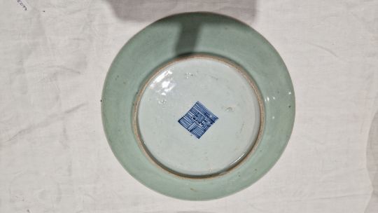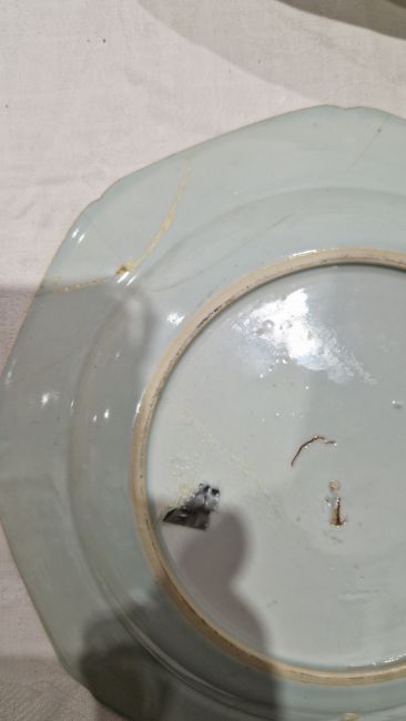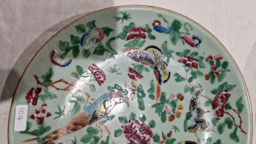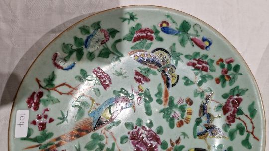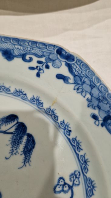 Chinese late Qing Dynasty yellow ground ginger jar and cover moulded with lotus and water plants, reserved on a mottled yellow ground, with wooden stand (hairline crack to shoulder), 12cm high, a Chinese export octagonal plate painted with exotic birds and willow flower strewn landscape (extensively cracked and repaired), 22cm wide and a Canton famille rose enamel plate painted with exotic birds and butterflies amongst peony, with blue seal mark to reverse, 25.7cm diameter (3)   Condition Report Blue & white plate - Light surface scratches, cracks and repairs throughout.Enamel plate - light suface scratches, accretions, chip to base ring.Vase - Light suface marks, accretions, hairline to shoulder.General wear and tear.